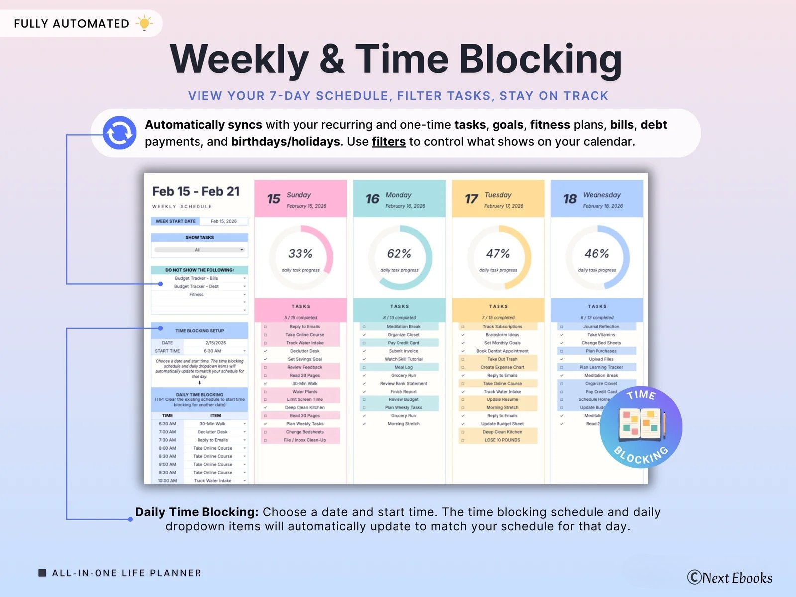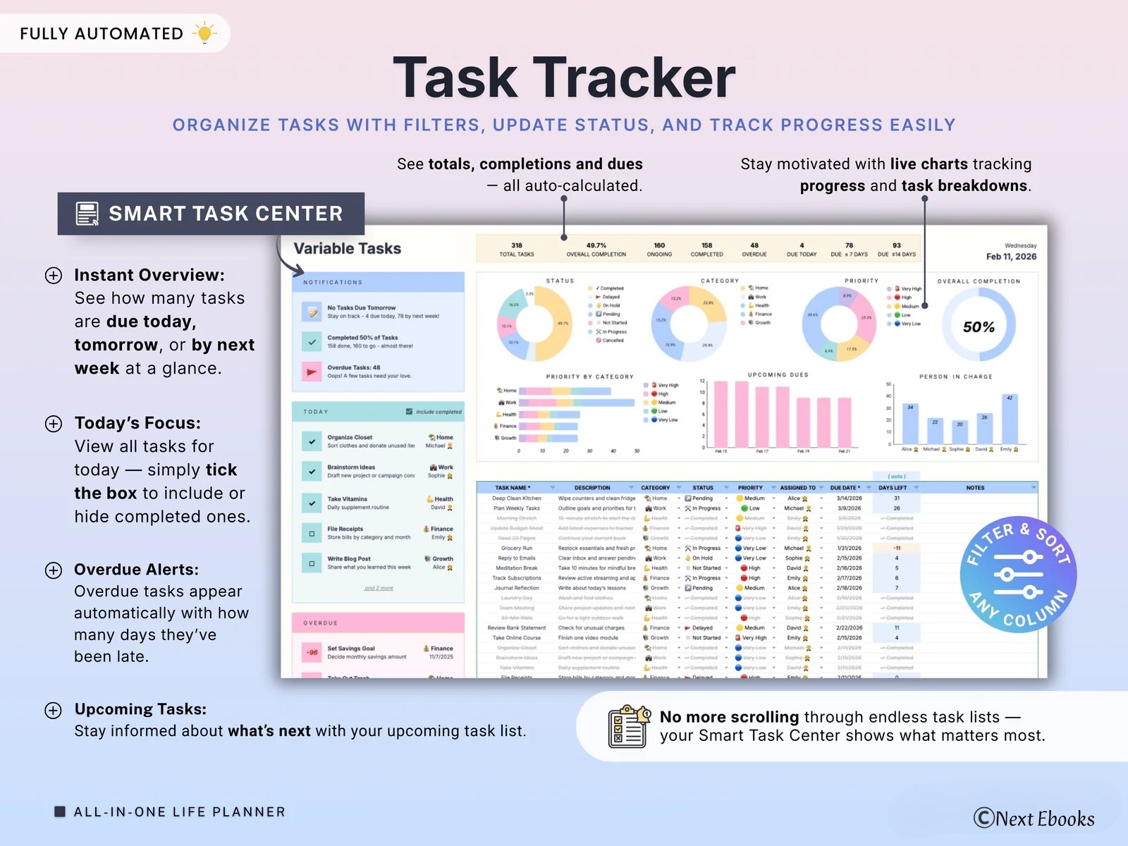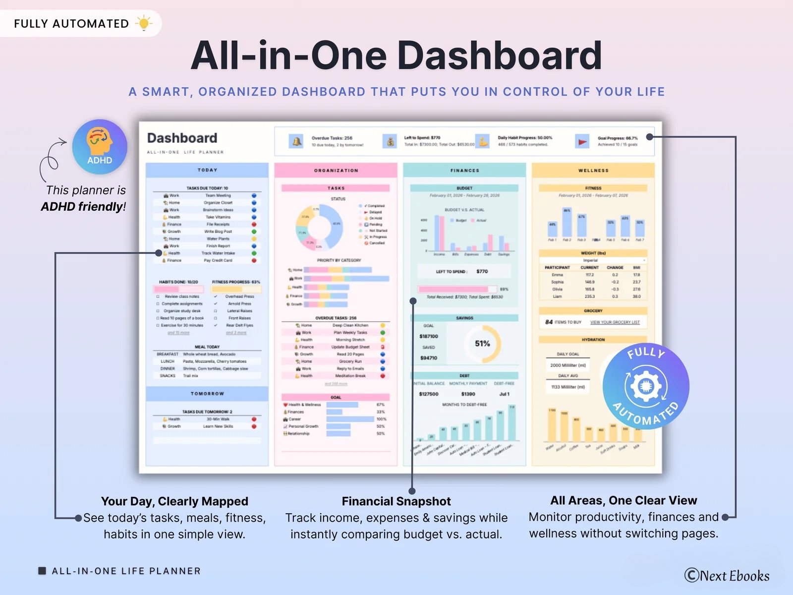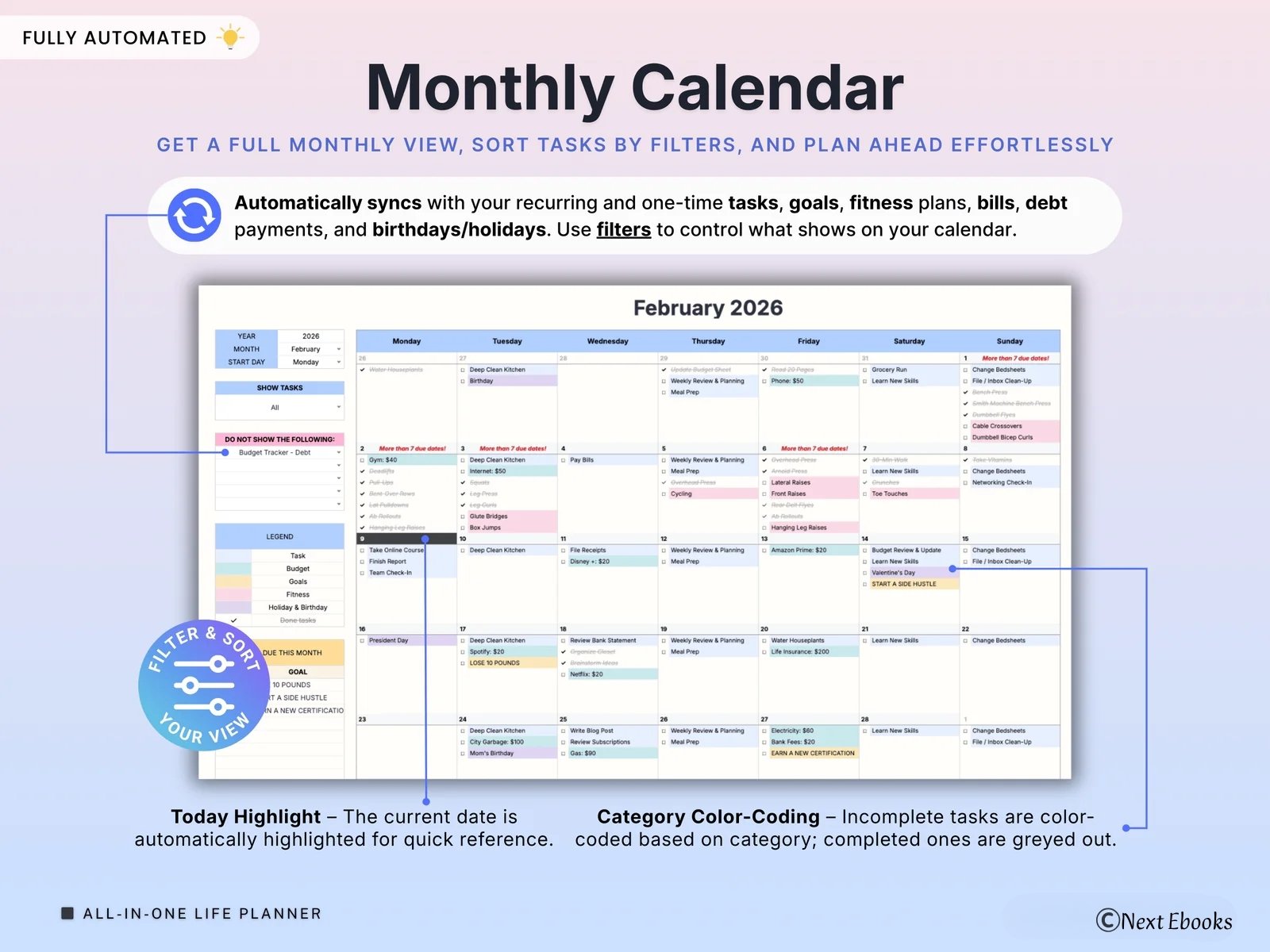 Stay on top of your life with this All-in-One Life Planner Spreadsheet, designed to manage every part of your daily routine. Plan your tasks, track habits, meals, fitness, goals, and recurring activities, and see all deadlines and schedules clearly in one organized system. With built-in sorting, filtering, and auto-updating weekly and monthly calendars, you always know what’s next. Plus, integrated budget tracking keeps your finances in check—everything you need to organize, track, and master your life lives in one place.