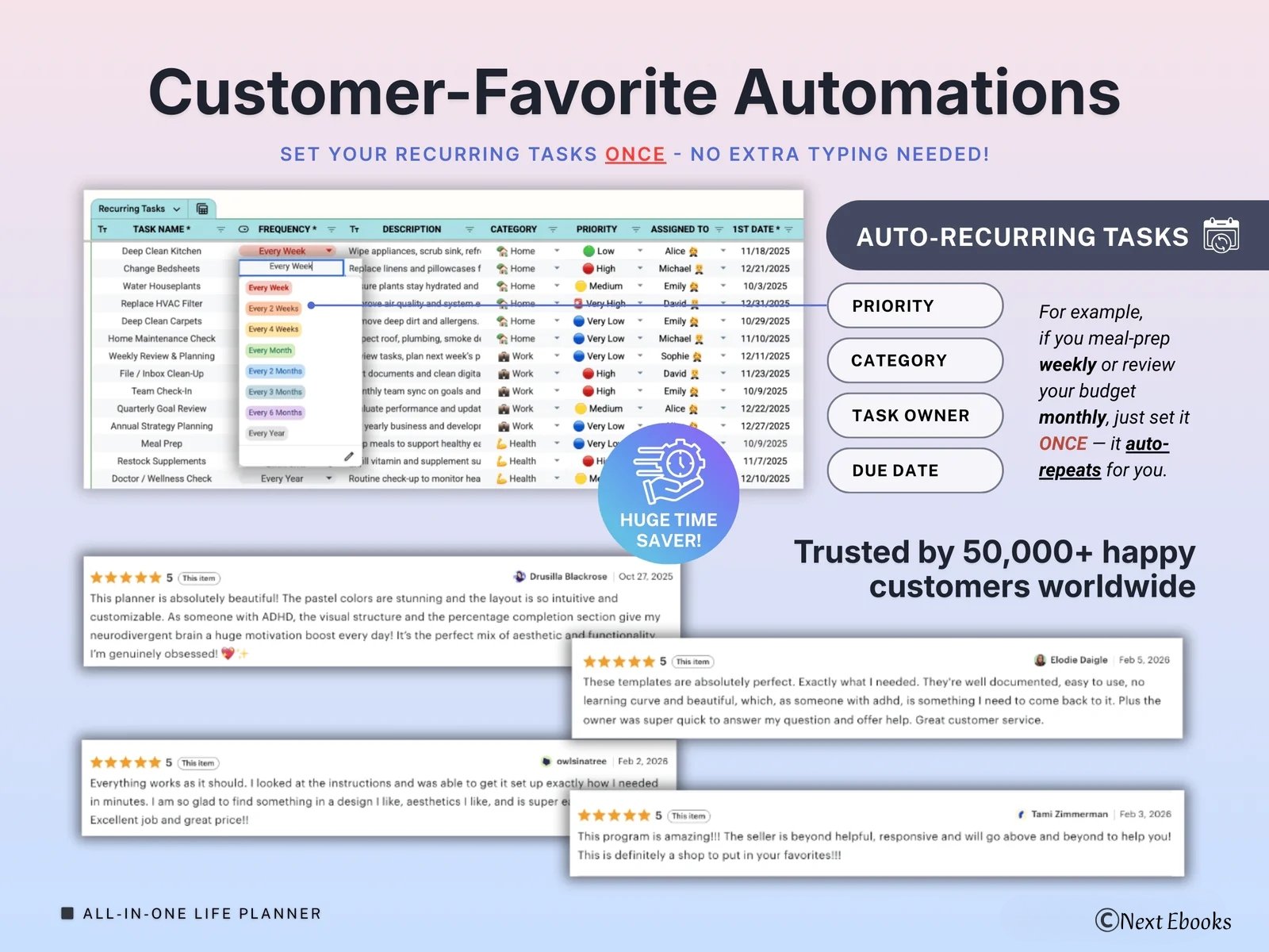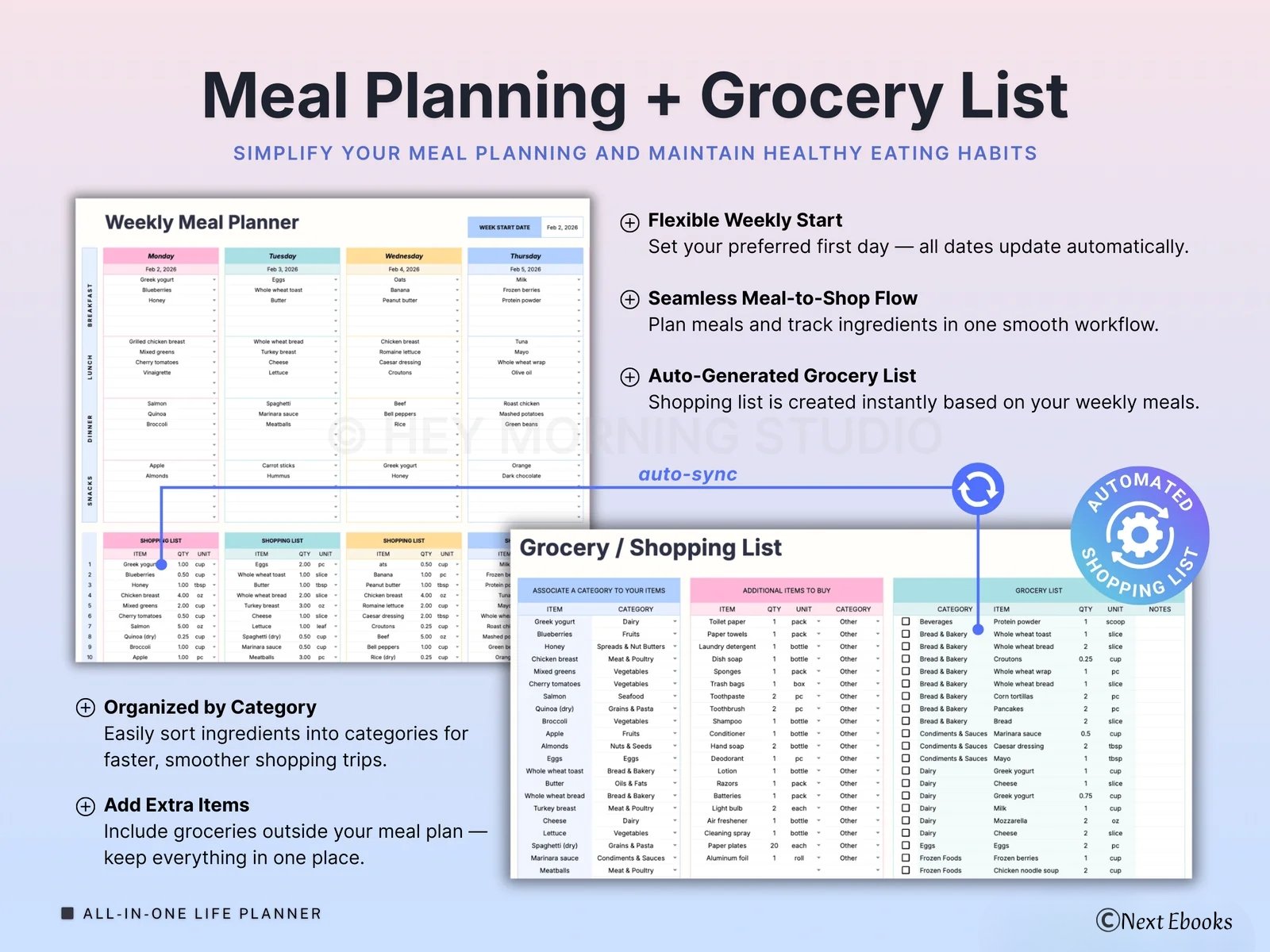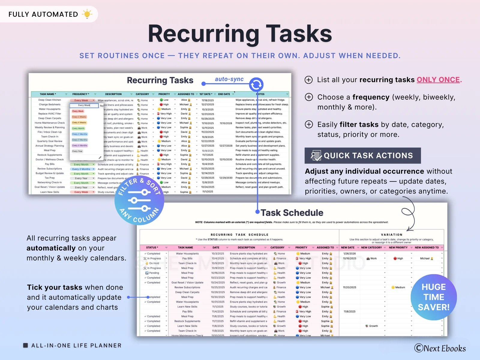 Stay on top of your life with this All-in-One Life Planner Spreadsheet, designed to manage every part of your daily routine. Plan your tasks, track habits, meals, fitness, goals, and recurring activities, and see all deadlines and schedules clearly in one organized system. With built-in sorting, filtering, and auto-updating weekly and monthly calendars, you always know what’s next. Plus, integrated budget tracking keeps your finances in check—everything you need to organize, track, and master your life lives in one place.