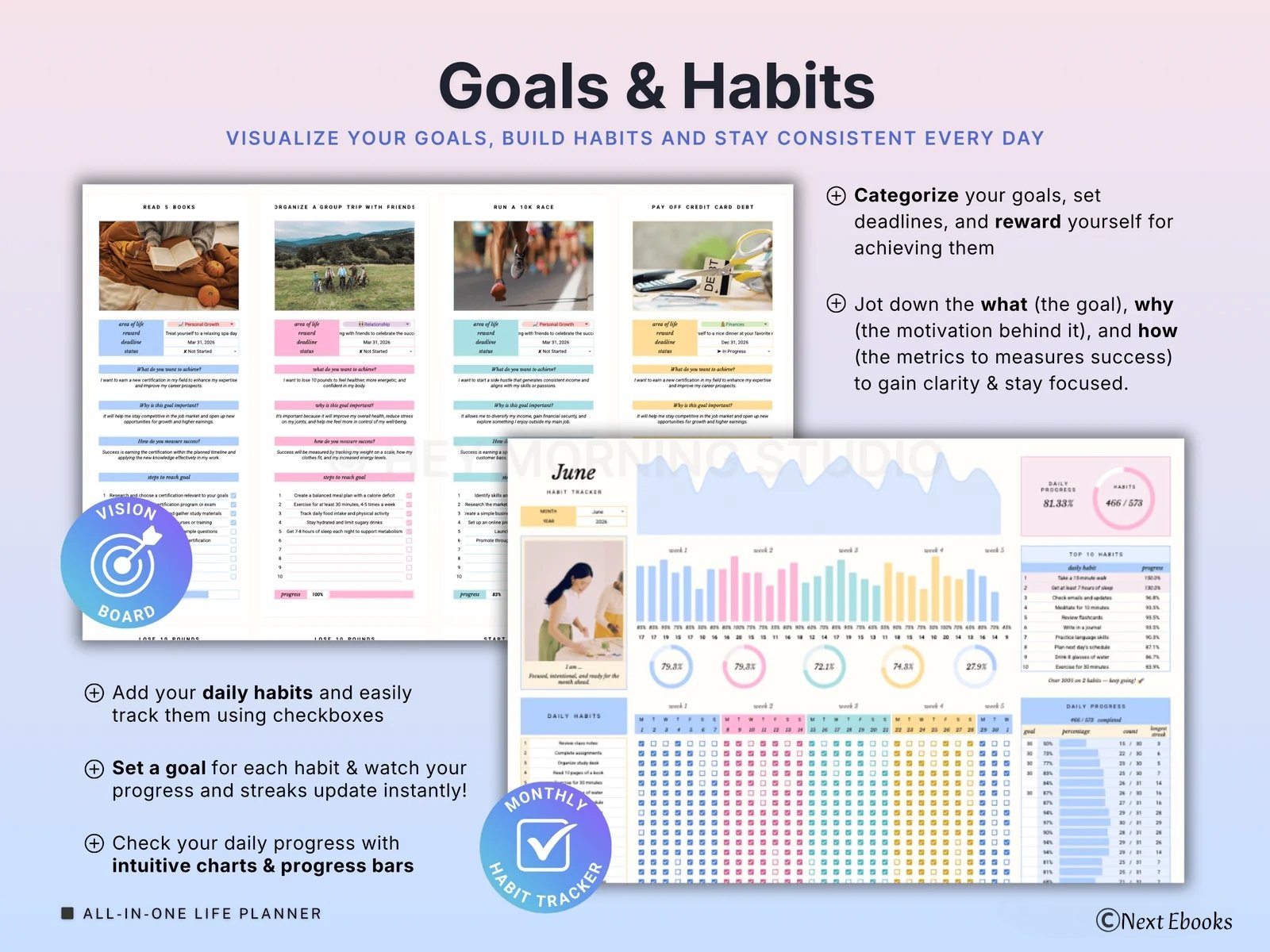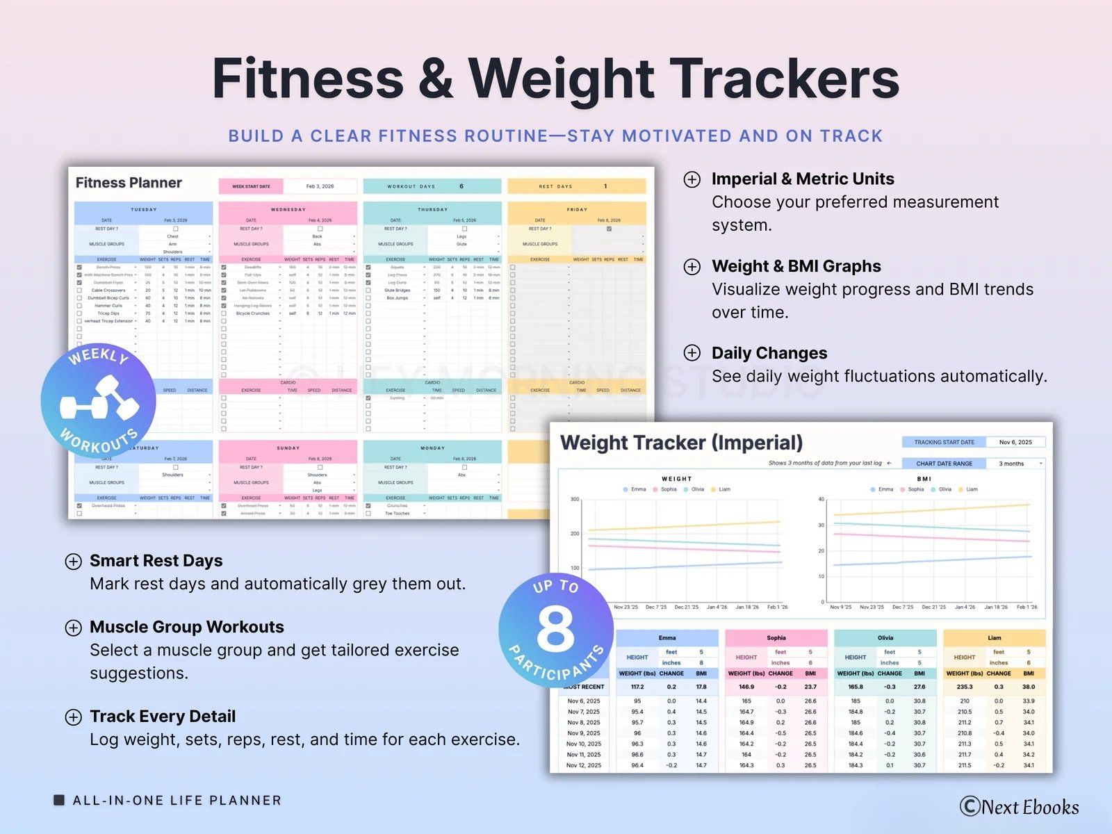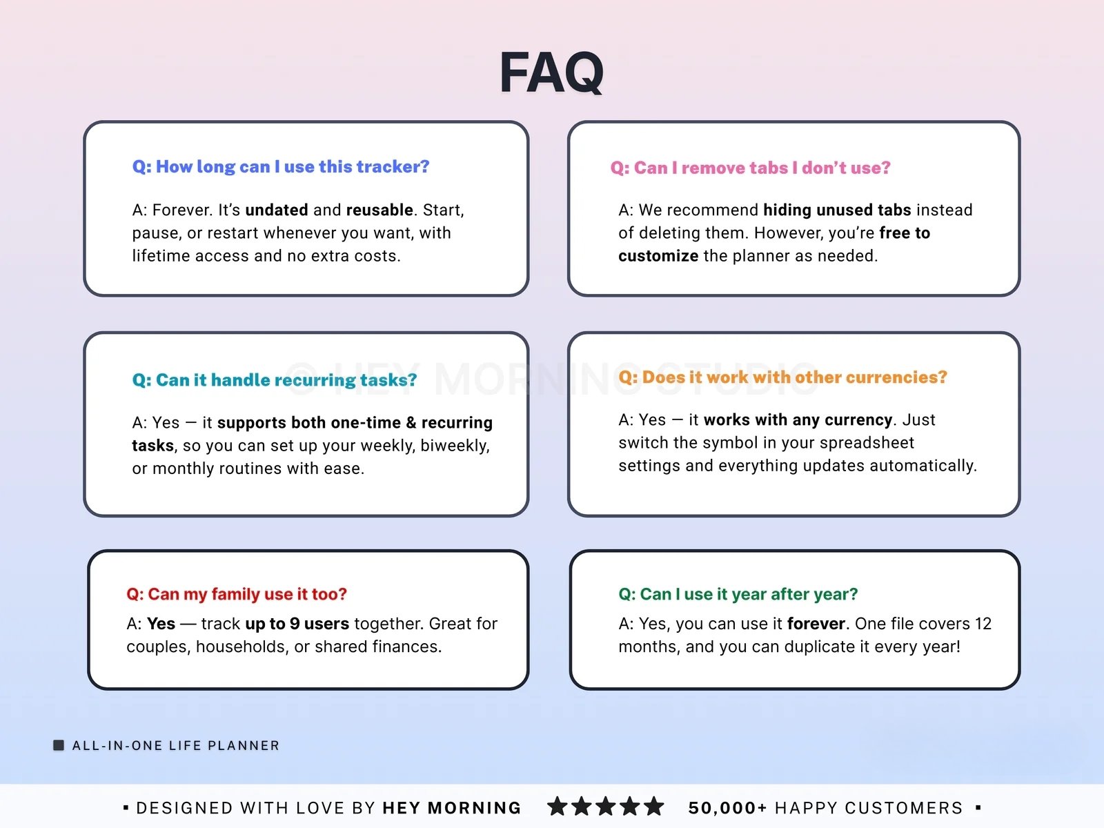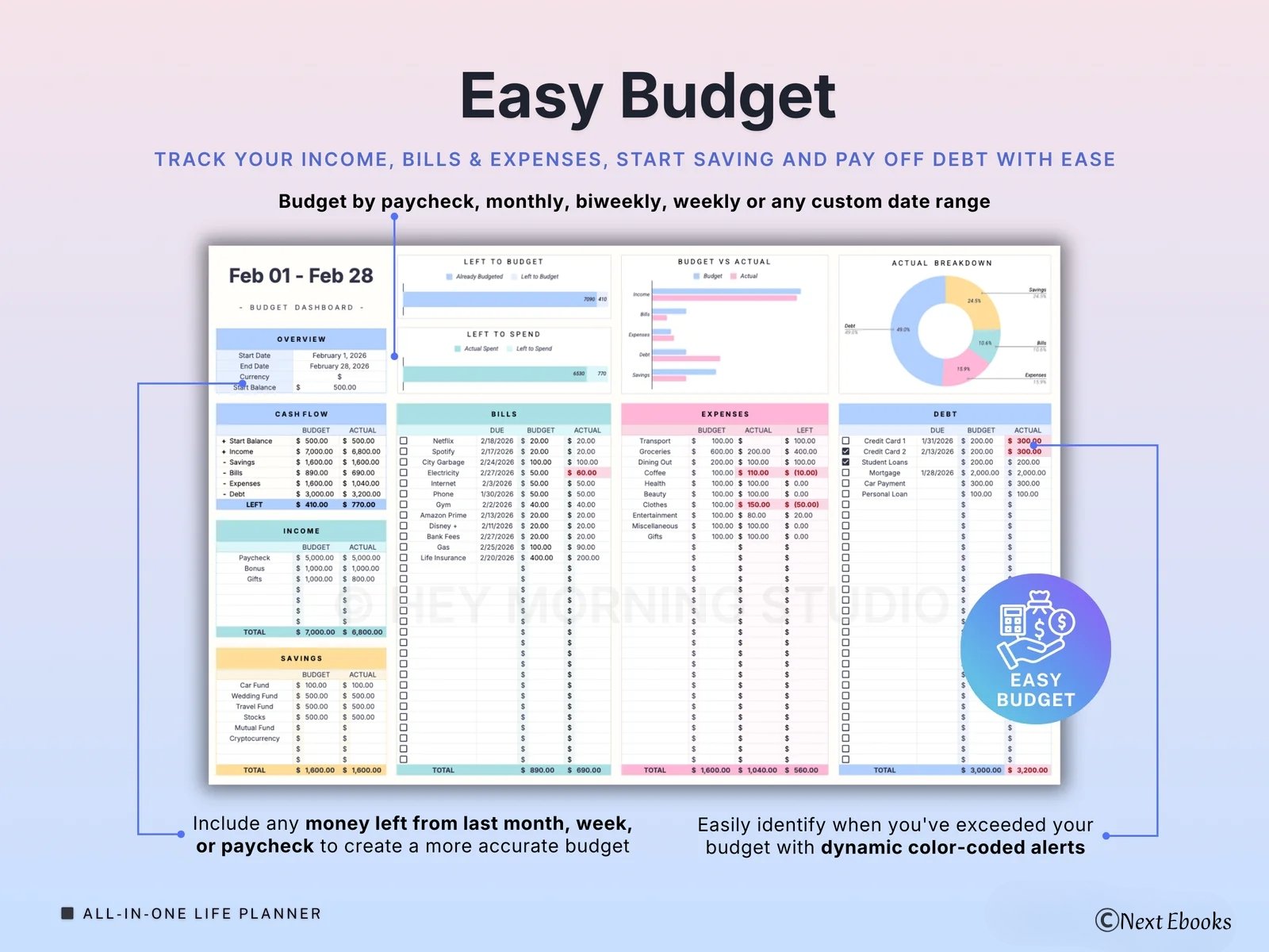 Stay on top of your life with this All-in-One Life Planner Spreadsheet, designed to manage every part of your daily routine. Plan your tasks, track habits, meals, fitness, goals, and recurring activities, and see all deadlines and schedules clearly in one organized system. With built-in sorting, filtering, and auto-updating weekly and monthly calendars, you always know what’s next. Plus, integrated budget tracking keeps your finances in check—everything you need to organize, track, and master your life lives in one place.