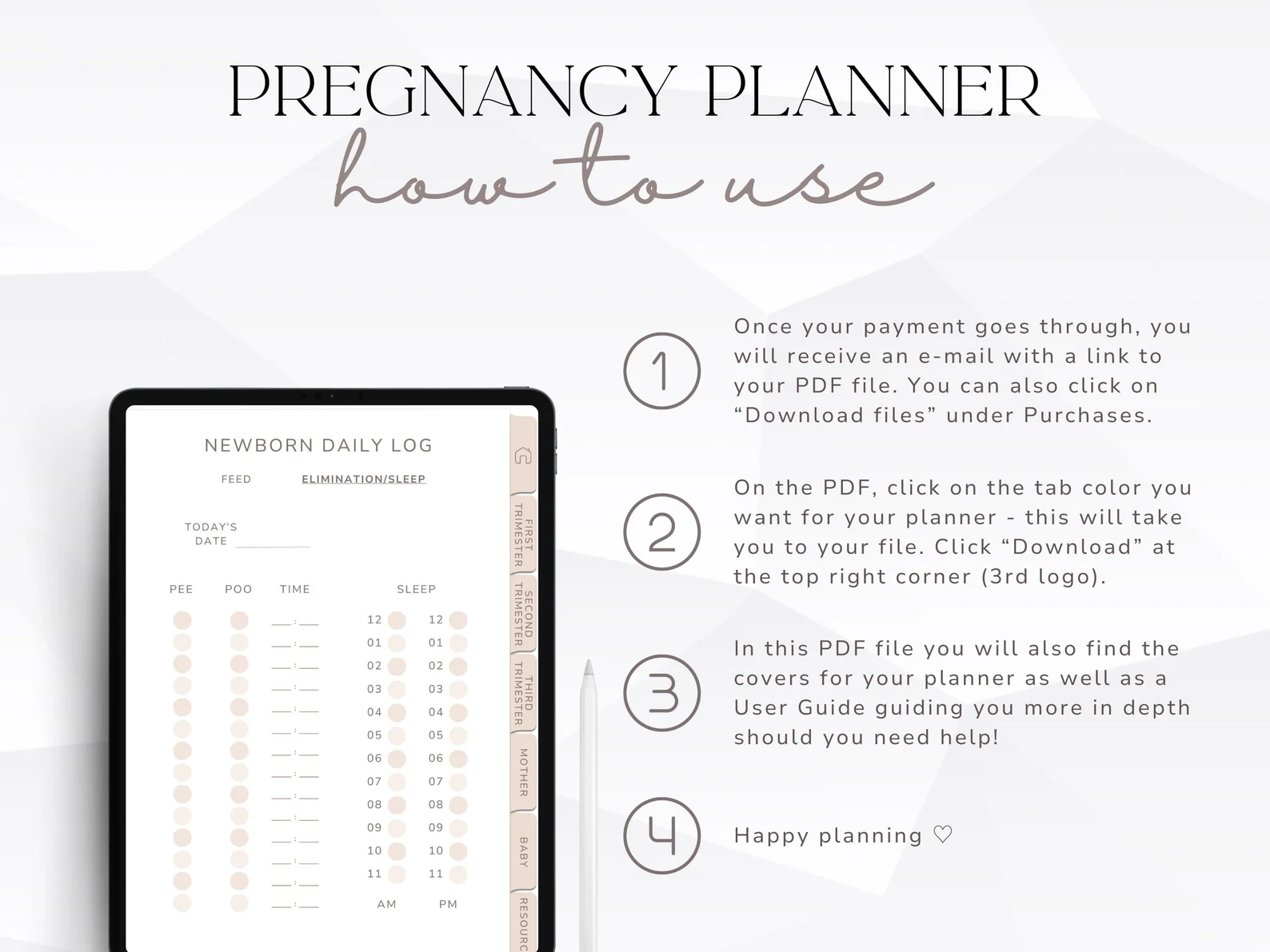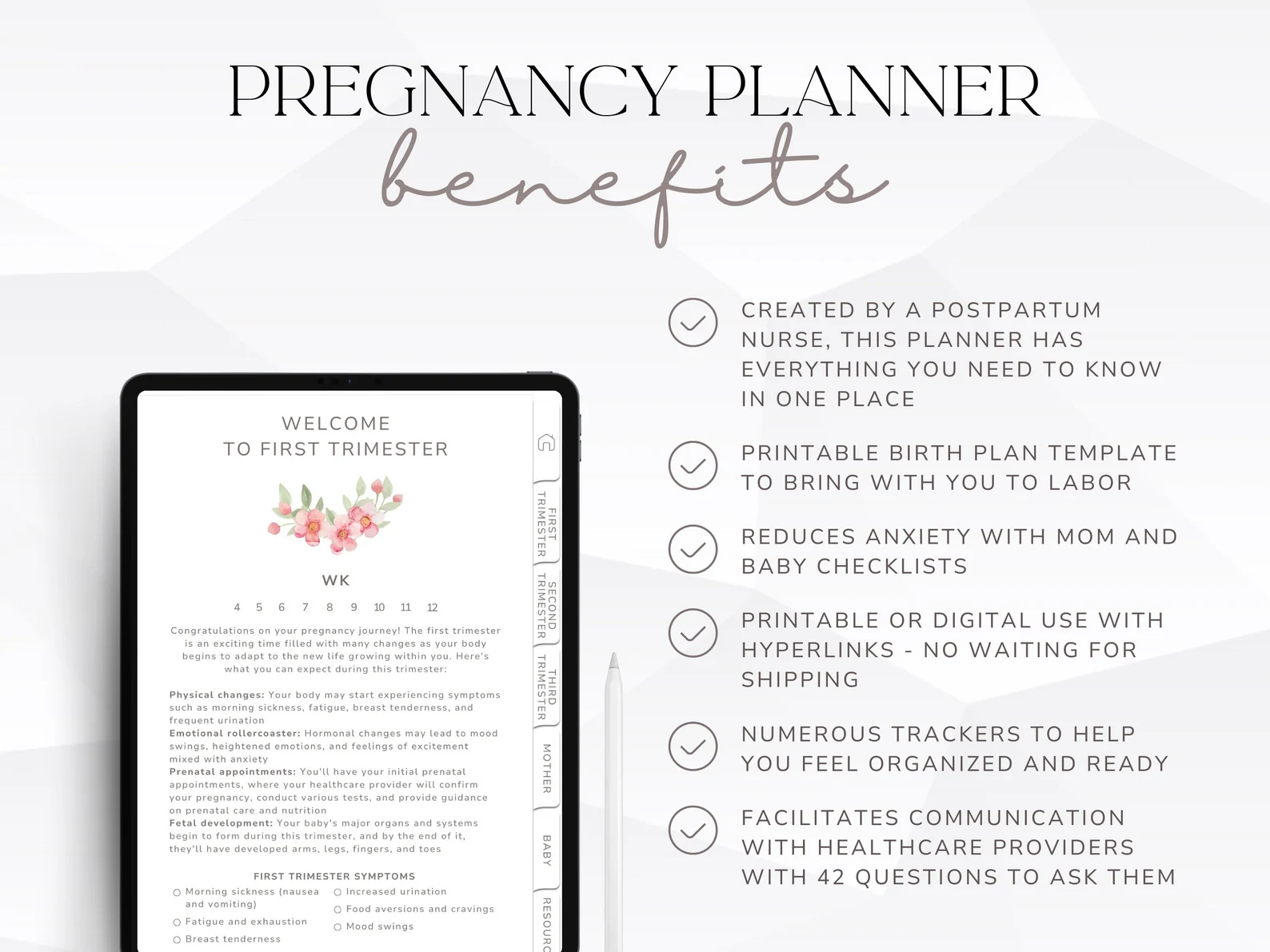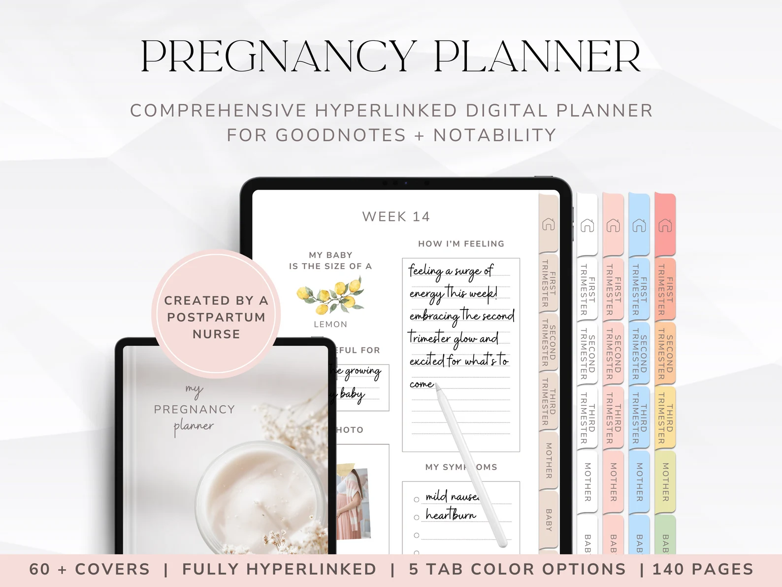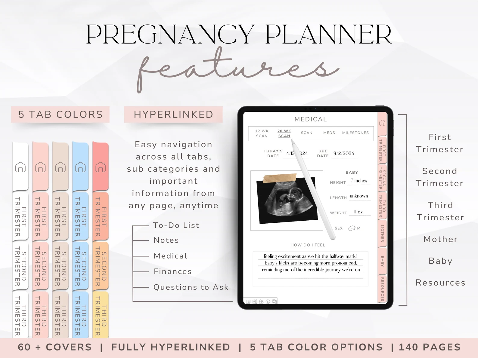Welcome to your Ultimate Digital Pregnancy Planner — a comprehensive, one-of-a-kind pregnancy companion. This is your new go-to for the journey of a lifetime, designed to seamlessly guide you through every step of your pregnancy.